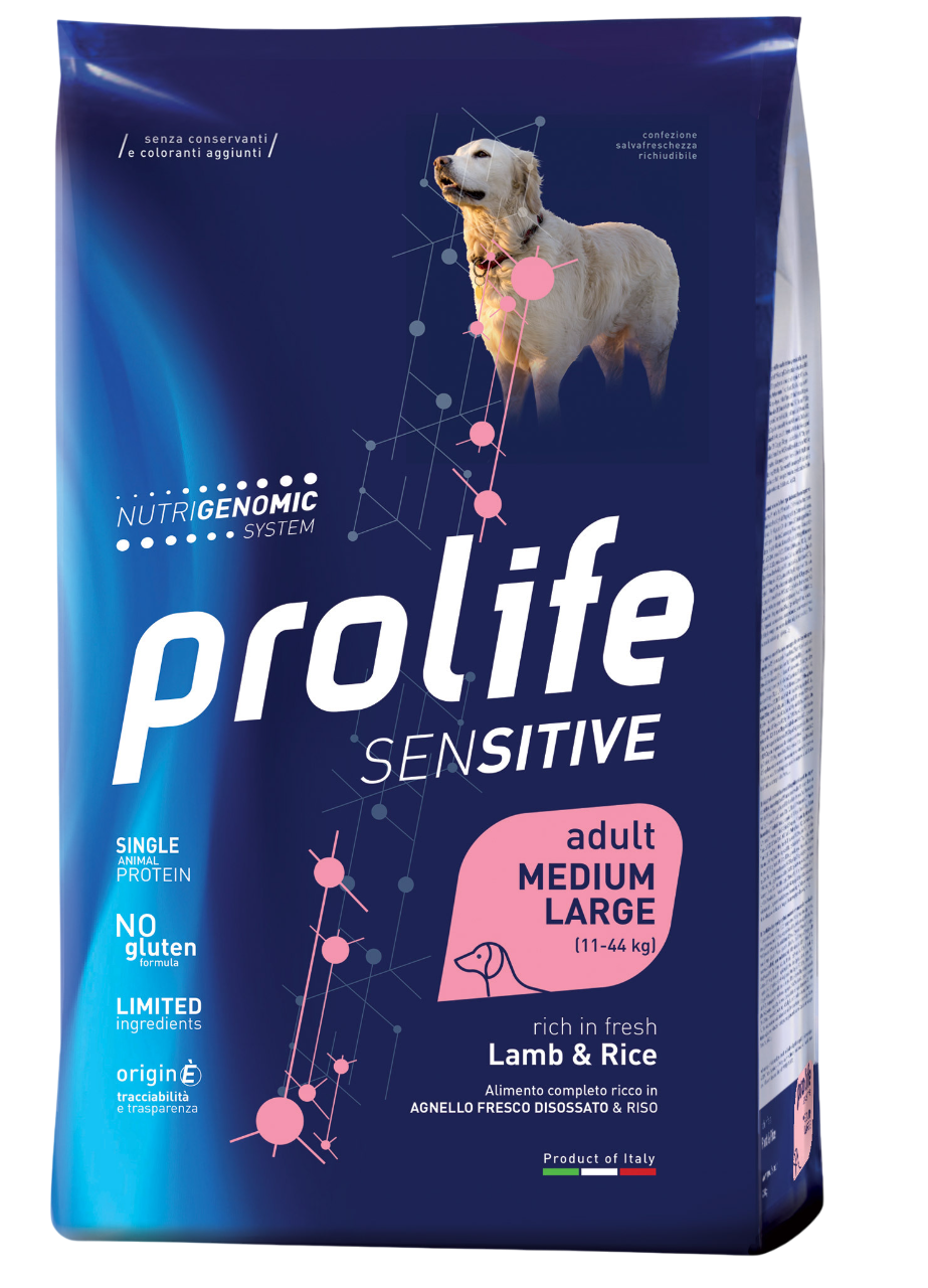 Prolife Sensitive Adult Medium/Large Lamb & Rice ist ein Alleinfuttermittel für ausgewachsene Hunde mittelgroßer und großer Rassen (11–44 kg), das so formuliert ist, dass es maximale Verdaulichkeit gewährleistet und die Gesundheit von Hunden mit Nahrungsmittelunverträglichkeiten unterstützt.