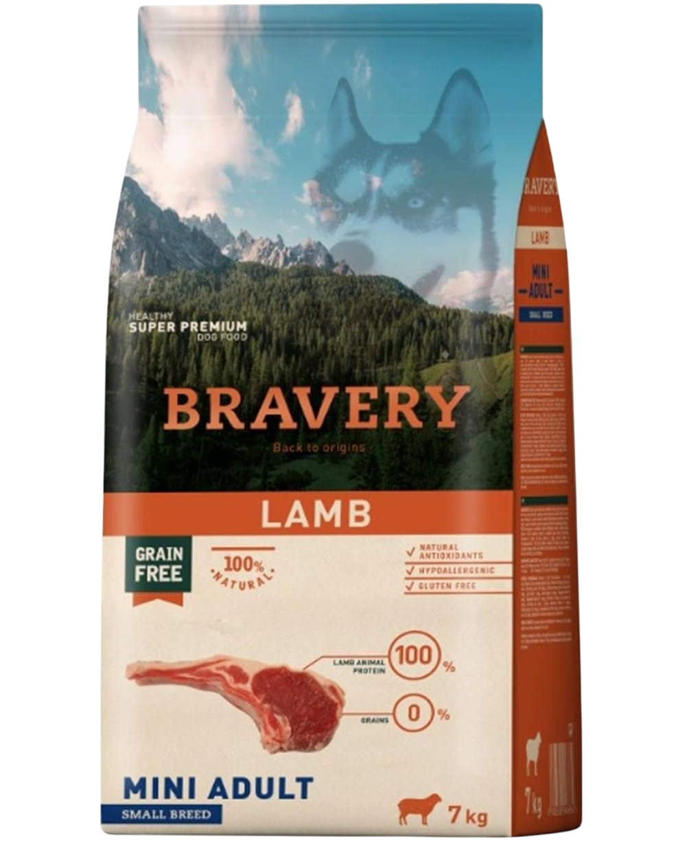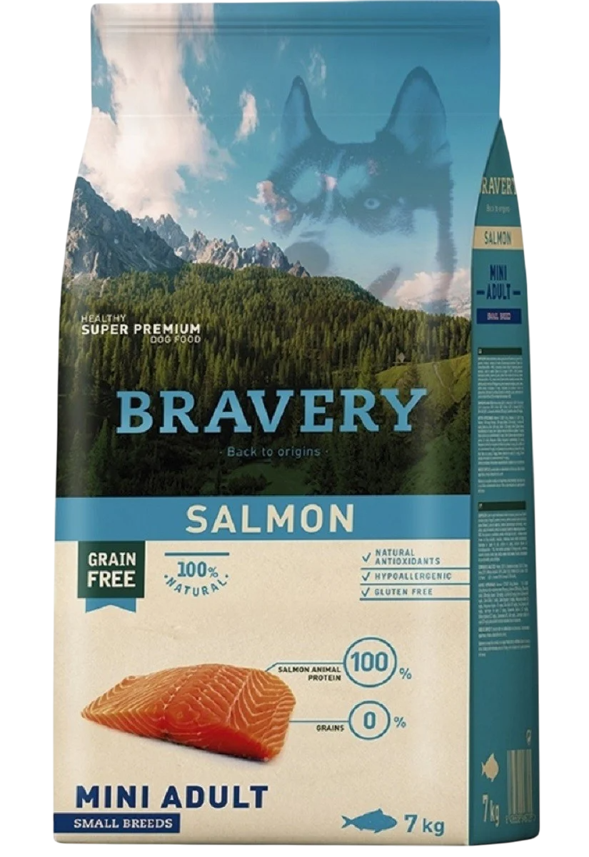 La linea Bravery Grain Free è formulata con un'unica fonte proteica animale (100% Salmone o 100% Agnello) e senza cereali, ideale anche per soggetti con sensibilità alimentari.