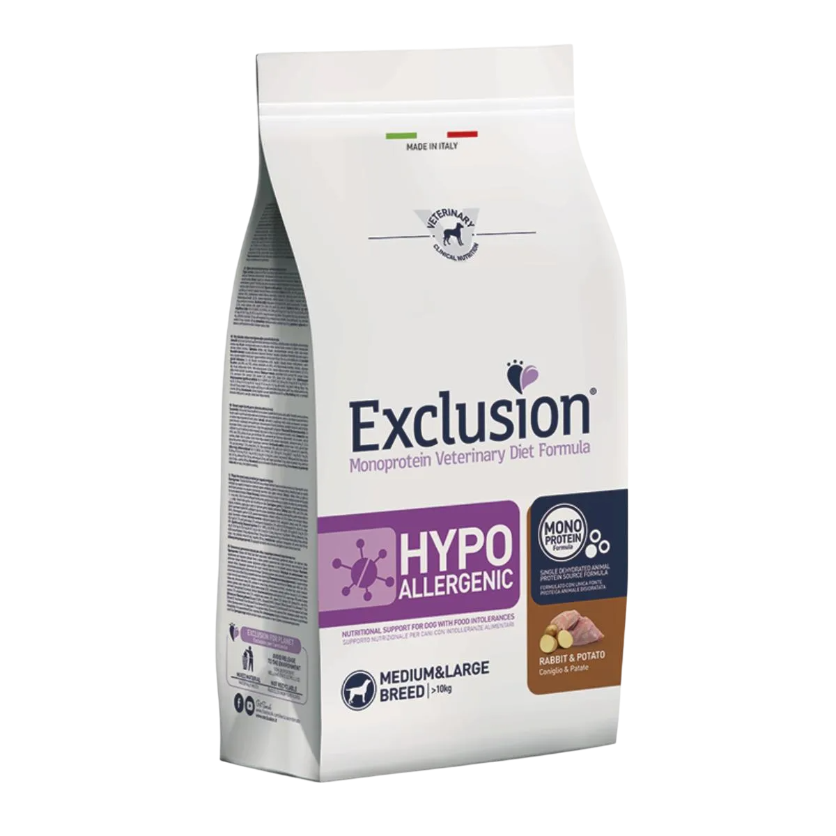 Alimento secco veterinario Exclusion Hypoallergenic per cani adulti di taglia media e grande, formulato con una sola fonte proteica animale e carboidrati selezionati per supportare cani con intolleranze alimentari o sensibilità digestive.