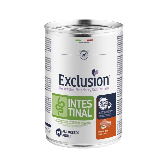 Exclusion Intestinal Maiale & Riso 400 g è un alimento umido monoproteico veterinario, formulato per supportare la funzione intestinale nei cani con disturbi gastrointestinali acuti o cronici .