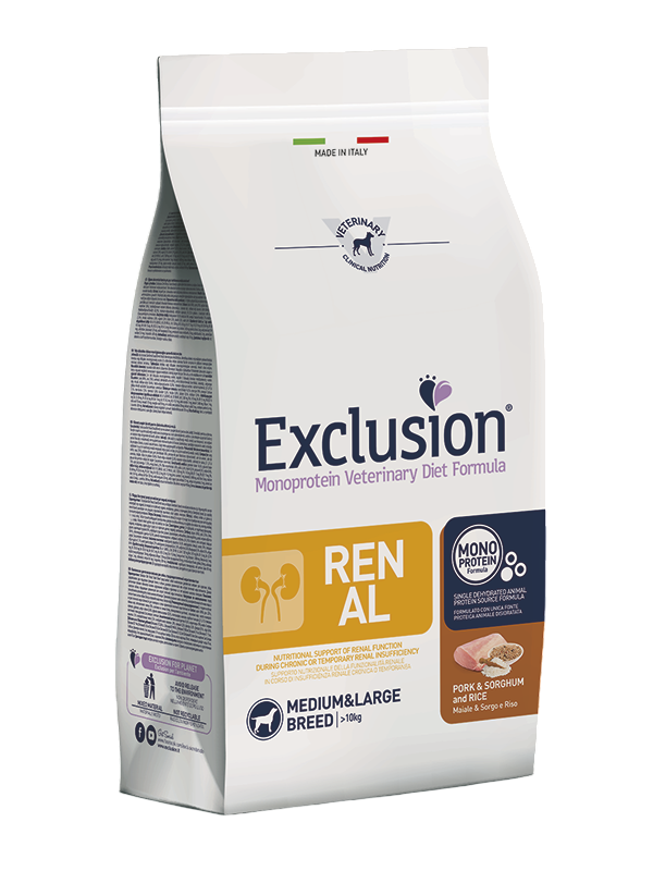 Exclusion Renal Medium & Large Breed 12 kg è un alimento secco veterinario completo, formulato per il supporto della funzione renale nei cani adulti di taglia media e grande (>10 kg) affetti da insufficienza renale cronica o temporanea .