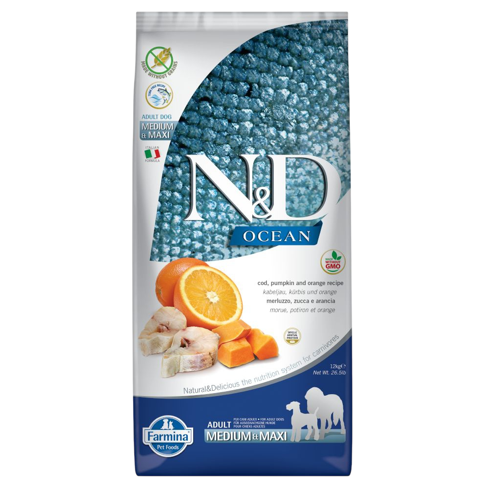 Farmina N&D Ocean Merluzzo, Zucca e Arancia Medium & Maxi è un alimento secco completo per cani adulti di taglia media e grande, formulato con ingredienti naturali di altissima qualità per garantire salute, vitalità e una pelle perfettamente curata.
