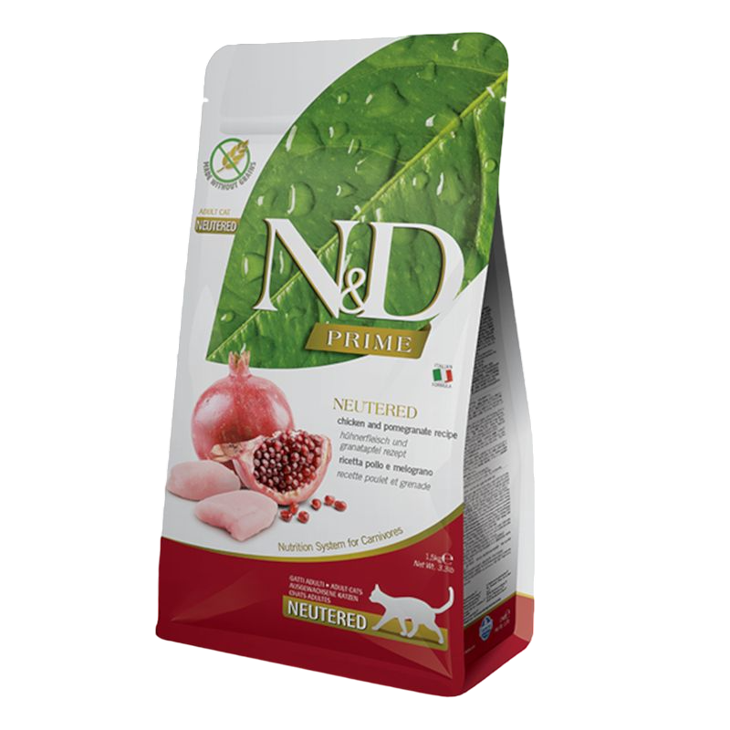 Farmina N&D Prime Neutered Pollo e Melograno è un alimento secco completo e bilanciato per gatti adulti sterilizzati, formulato per aiutare a mantenere il peso forma e la massa muscolare magra senza rinunciare al gusto e alla qualità.