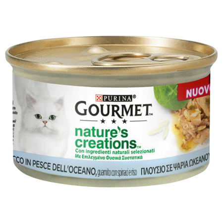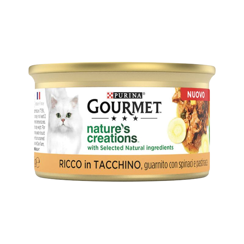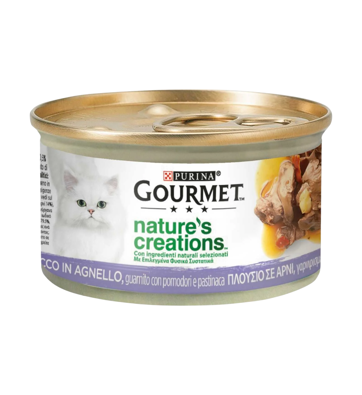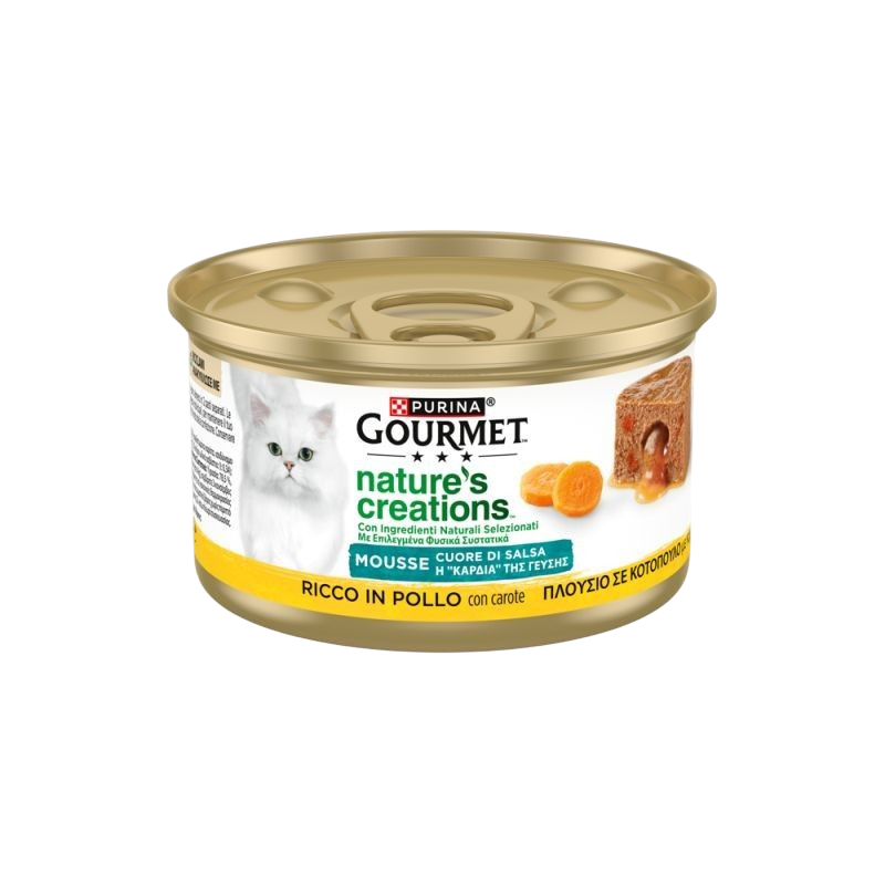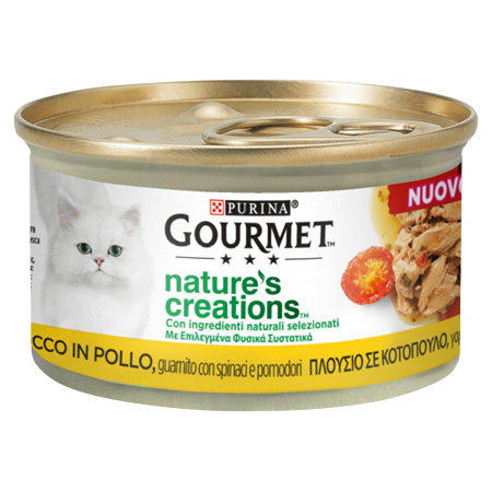 Gourmet Nature’s Creations è preparato con ingredienti naturali selezionati, per offrire un pasto bilanciato, gustoso e ispirato alla natura. Ogni ricetta è ricca in carne o pesce, accompagnata da verdure e ingredienti di qualità, per soddisfare anche i palati più raffinati.