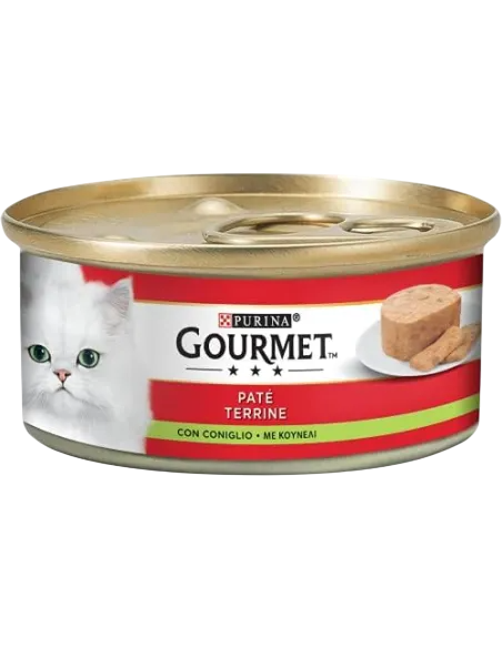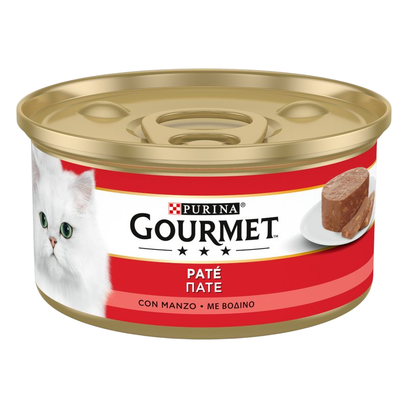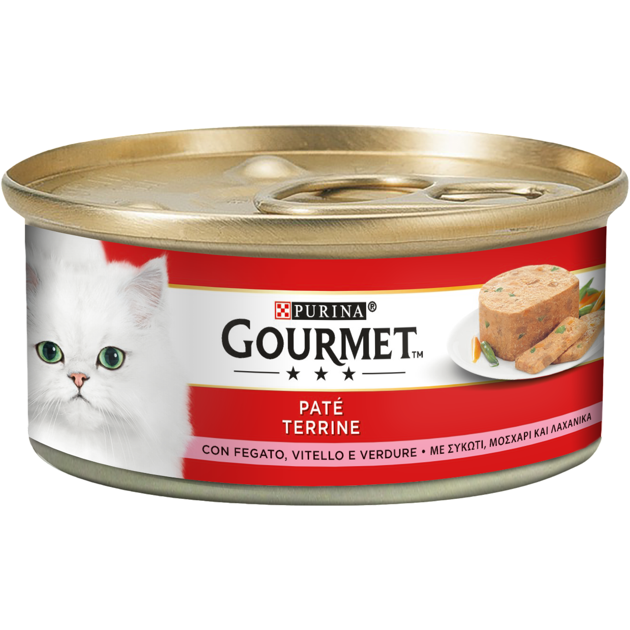 Gourmet Red Paté / Terrine 195 g è un alimento umido completo per gatti adulti, preparato con ingredienti selezionati e disponibile in diversi gusti prelibati.