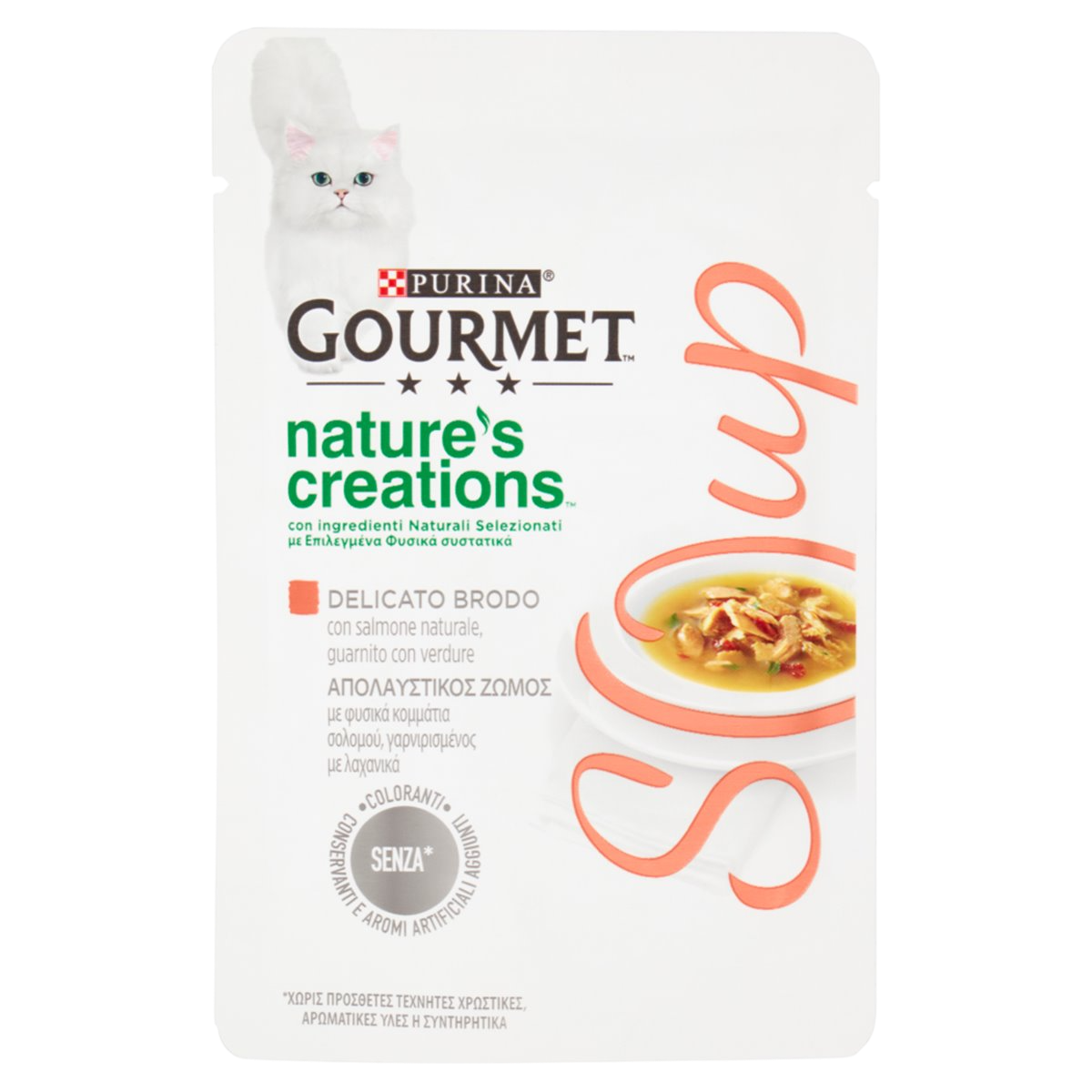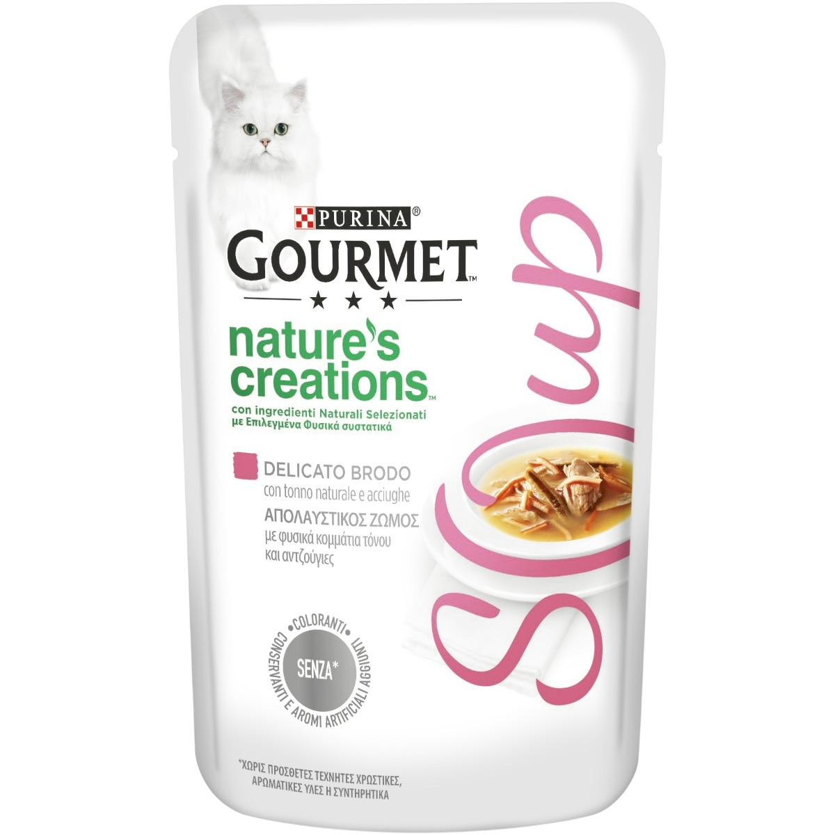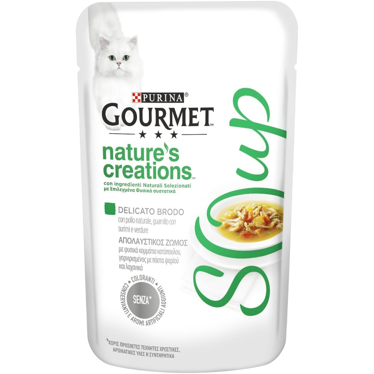 Ideale per i gatti più esigenti, Gourmet Soup è servito in pratiche bustine monoporzione da 40 g: perfette per offrire ogni giorno una coccola speciale, senza conservanti, coloranti o aromi artificiali aggiunti.