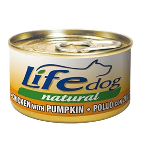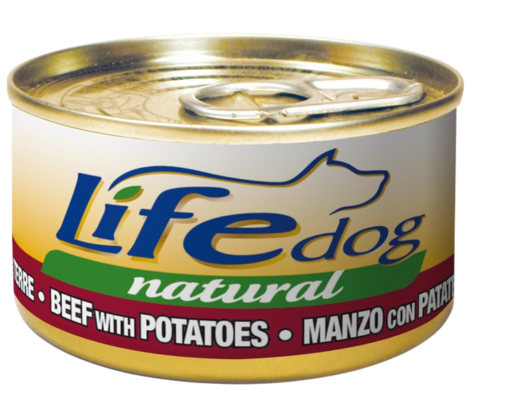 Alimento umido completo e naturale per cani, preparato con ingredienti selezionati al gusto manzo e pollo. Confezione da 24 vaschette da 90g.
