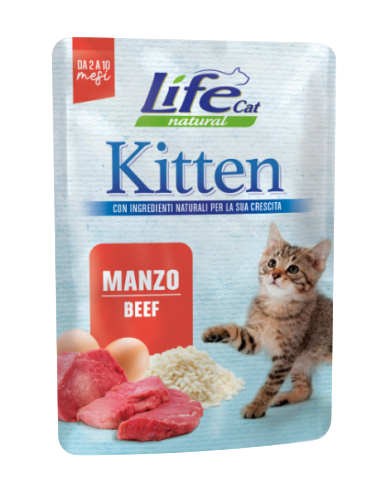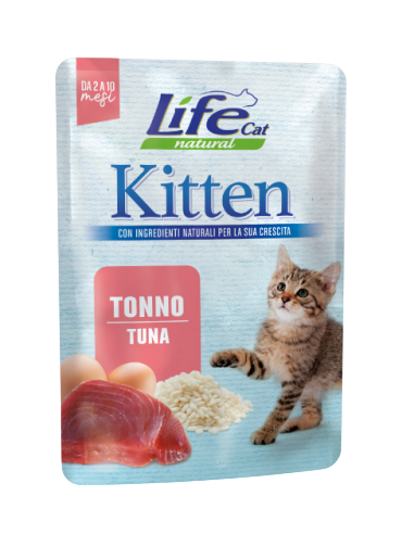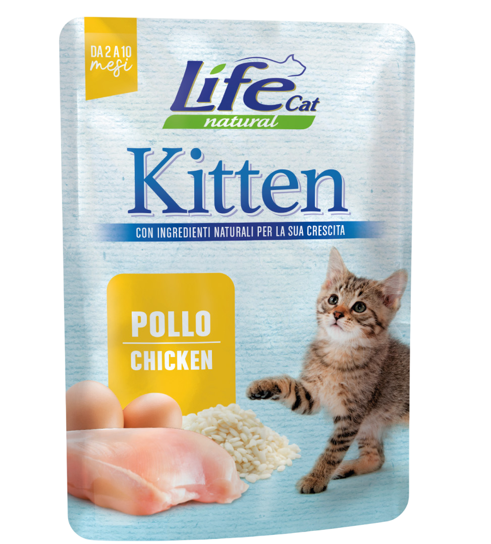 Le buste LifeCat Kitten 70g sono preparate con ingredienti naturali, carne o pesce di alta qualità e riso, senza coloranti né conservanti artificiali.