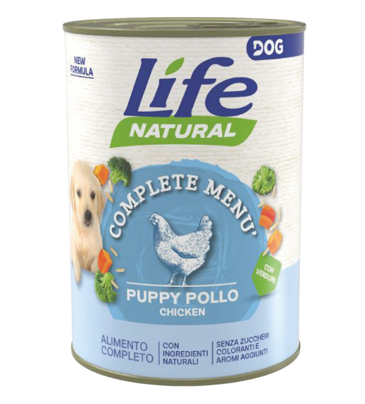 Alimento umido naturale per cani adulti, preparato con ingredienti selezionati e ricette genuine. Confezione da 24 lattine da 400g.