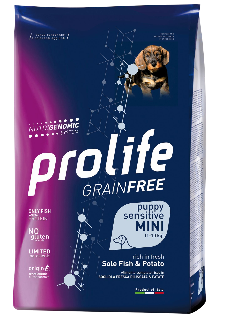 La linea Prolife Puppy Mini Grain Free è pensata per i cuccioli di piccola taglia (1–10 kg) con esigenze nutrizionali specifiche e sensibilità digestive.