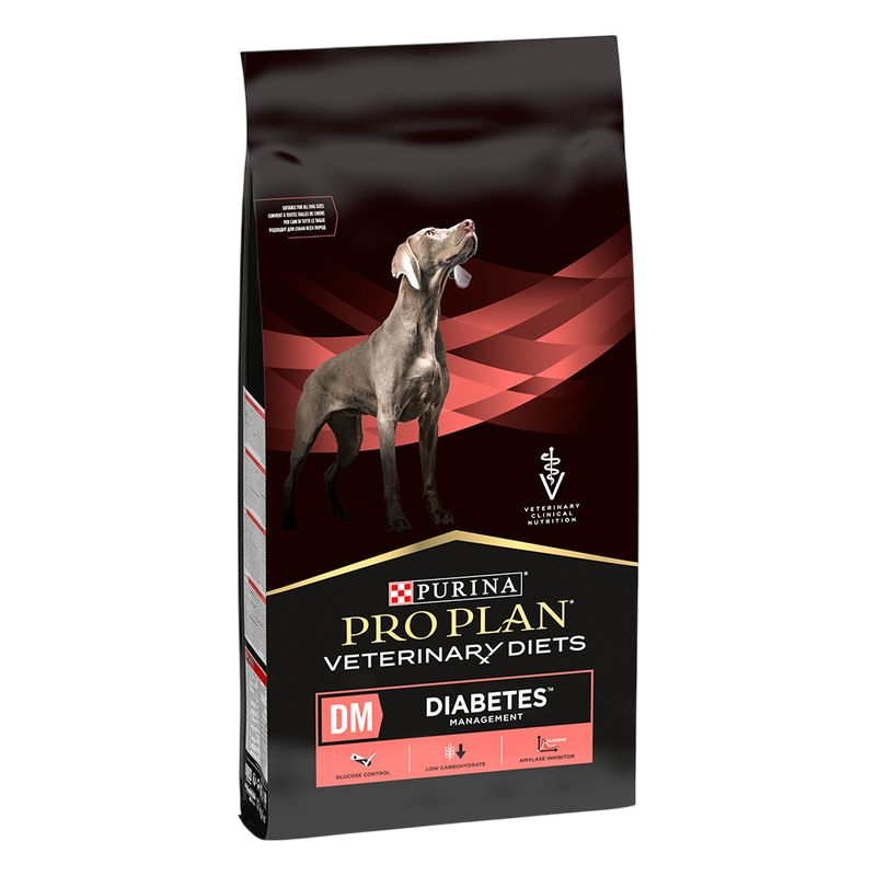 Purina Pro Plan Veterinary Diets DM Diabetes Management Cane 12 kg è un alimento secco completo studiato per il supporto nutrizionale dei cani affetti da diabete mellito.